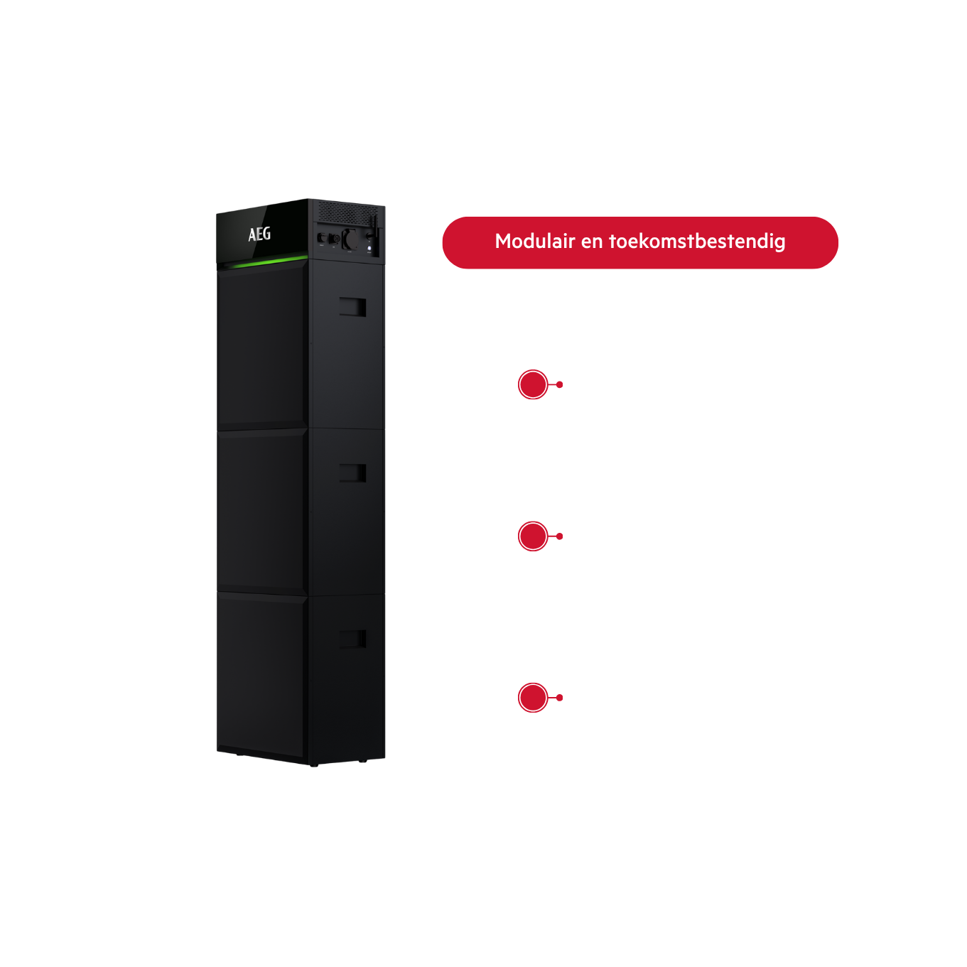 Met de AEG thuisbatterij kies je voor comfort en controle. Je installeert hem eenvoudig binnen of buiten en kunt direct beginnen met het opslaan van jouw zonne-energie. Extra capaciteit nodig? Breid moeiteloos uit met aanvullende modules. Voorbereid op de toekomst, inclusief slimme P1-koppeling en ondersteund door onze Nederlandse service-experts.